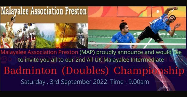 യുകെയിലെ തന്നെ കരുത്തരായ അസോസിയേഷനുകളിൽ ഒന്നായ മലയാളി അസോസിയേഷൻ ഓഫ് പ്രസ്റ്റൺ (MAP) അണിയിച്ചൊരുക്കുന്ന രണ്ടാമത് ഓൾ യു കെ ബാഡ്മിൻറൺ ടൂർണ്ണമെൻറ് സെപ്റ്റംബർ മൂന്നാം തീയതി 9 മണിമുതൽ പ്രസ്റ്റൺ കോളേജ് സ്പോർട്സ് ഹാളിൽ (PR2 8UR) വച്ച് നടത്തപ്പെടുന്നു. മെൻസ് ഡബിൾസ് ഇന്റർമീഡിയറ്റ് വിഭാഗത്തിലാണ് മത്സരങ്ങൾ നടക്കുക.