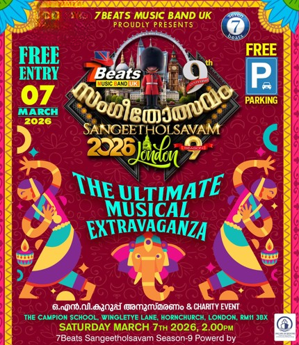 സംഗീത വിരുന്നും, സംഘാടക മികവും, ഒപ്പം ജീവ കാരുണ്യ പ്രവർത്തനവും കൊണ്ട് യൂകെ മലയാളികൾ ഹൃദയത്തിലേറ്റിയ 7 ബീറ്റ്സ് സംഗീതോത്സവം സീസൺ 9 ന്റെ ഭാഗമാകുവാൻ ഏവരെയും ഹോൺചർച്ച് കാമ്പ്യൻ സ്കൂൾ ഓഡിറ്റോറിയത്തിലേക്കു ഹൃദയപൂർവ്വം ക്ഷണിച്ചുകൊള്ളുന്നു. 2026 മാർച്ച് ഏഴിന് ശനിയാഴ്ച ഉച്ചക്ക് രണ്ടു മണിമുതൽ രാത്രി പത്തുമണി വരെ നീണ്ടു നിൽക്കുന്ന സംഗീതരാവിൽ കലാസ്വാദകർക്കു തികച്ചും സൗജന്യമായിട്ടാവും പ്രവേശനം അനുവദിക്കുക.