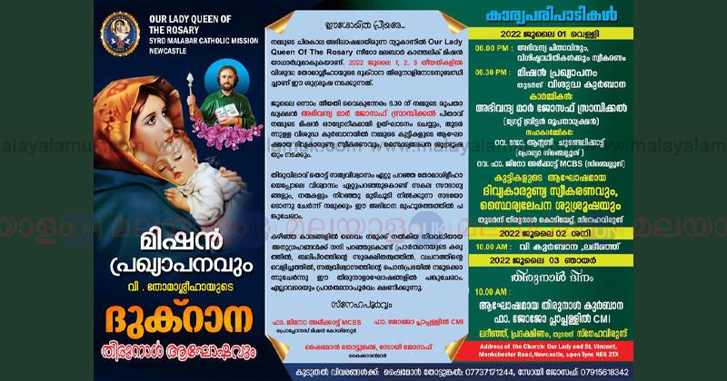 ഗ്രേറ്റ് ബ്രിട്ടണ് സീറോ മലബാര് രൂപതയുടെ മെത്രാന് മാര് ജോസഫ് സ്രാമ്പിക്കലിന്റെ അജപാലന ശുശ്രൂഷയുടെ ഭാഗമായി വിഭാവനം ചെയ്ത മിഷനുകളുടെ ഔദ്യോഗിക പ്രഖ്യാപനവും ഇതോടനുബന്ധിച്ച് നടത്തുന്നതാണ്. രൂപതയിലെ ലണ്ടന് റീജിയനിലുള്ള ബ്രന്ഡ് വുഡ്, വെസ്റ്റ് മിനിസ്റ്റര് ചാപ്ലയിന്സികളിലുള്ള മിഷനുകളുടെ പ്രഖ്യാപനം കര്ദ്ദിനാള് മാര് ജോര്ജ് ആലഞ്ചേരിയുടെ മുഖ്യകാര്മ്മികത്വത്തില് ഡിസംബര് മാസം 5 ബുധനാഴ്ച 6.00 pm ന് വല്ത്താംസ്റ്റോയിലെ ഔവര് ലേഡി & സെന്റ് ജോര്ജ്ജ് പള്ളിയില് വച്ച് മരിയന് ദിന ശുശ്രൂഷയോടൊപ്പം നടത്തുന്നതാണ്.