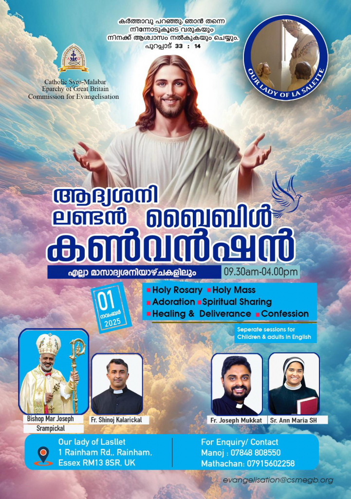 റയിൻഹാം: ഗ്രേറ്റ് ബ്രിട്ടൻ സീറോമലബാർ എപ്പാർക്കി ഇവാഞ്ചലൈസേഷൻ കമ്മീഷന്റെ നേതൃത്വത്തിൽ, ലണ്ടനിൽ വെച്ച് മാസം തോറും സംഘടിപ്പിക്കുന്ന ‘ആദ്യ ശനിയാഴ്ച്ച ബൈബിൾ കൺവെൻഷൻ’ നവംബർ 1 ന് ശനിയാഴ്ച ഉണ്ടായിരിക്കുന്നതാണ്. ലണ്ടനിൽ റയിൻഹാം ഔർ ലേഡി ഓഫ് ലാസലേറ്റ് കത്തോലിക്കാ ദേവാലയത്തിലാണ് കൺവെൻഷൻ ക്രമീകരിച്ചിരിക്കുന്നത്.