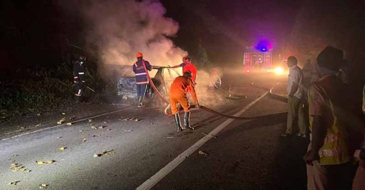 അഗ്നിരക്ഷാ സേന പെട്ടെന്ന് സ്ഥലത്തെത്തി തീ അണച്ചു. കാറിന്റെ മുൻഭാഗത്താണ് കൂടുതൽ നാശനഷ്ടമുണ്ടായത്. തീപിടിത്തത്തിന്റെ കാരണം വ്യക്തമല്ല; മെക്കാനിക്കൽ തകരാറായിരിക്കാമെന്നാണ് പ്രാഥമിക നിഗമനം.