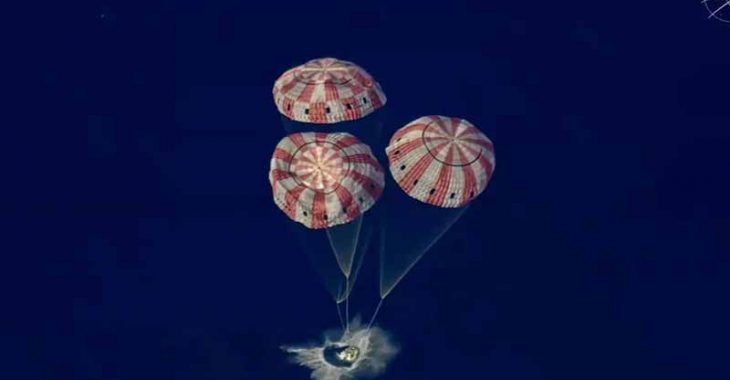 മണിക്കൂറിൽ ഏകദേശം 40,000 കിലോമീറ്റർ വേഗത്തിൽ ഭൂമിയുടെ അന്തരീക്ഷത്തിലേക്ക് പ്രവേശിച്ച പേടകം 2,800 ഡിഗ്രി സെൽഷ്യസ് വരെ കഠിന ചൂട് നേരിട്ടു. ശക്തമായ താപ കവചം യാത്രികരെ സംരക്ഷിച്ചു. അന്തരീക്ഷ പ്രവേശനത്തിനിടെ പ്ലാസ്മ പാളി രൂപപ്പെട്ടതോടെ കുറച്ച് സമയം ആശയവിനിമയം തടസ്സപ്പെട്ടു. തുടർന്ന് പാരഷൂട്ടുകൾ വിടർത്തി വേഗത കുറച്ച് പേടകം സമുദ്രത്തിൽ പതിച്ചു. രക്ഷാപ്രവർത്തകർ ഉടൻ തന്നെ സംഘത്തെ സുരക്ഷിതമായി കരയിൽ എത്തിച്ചു.
