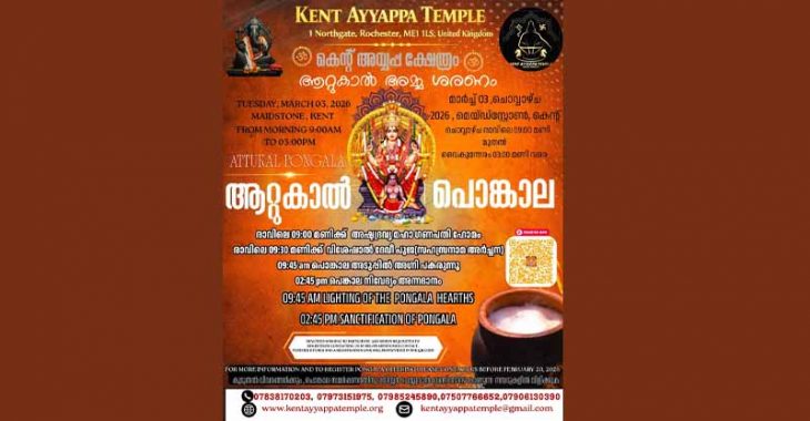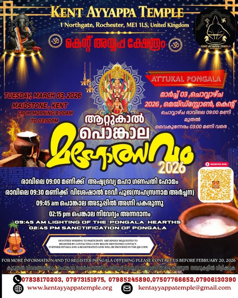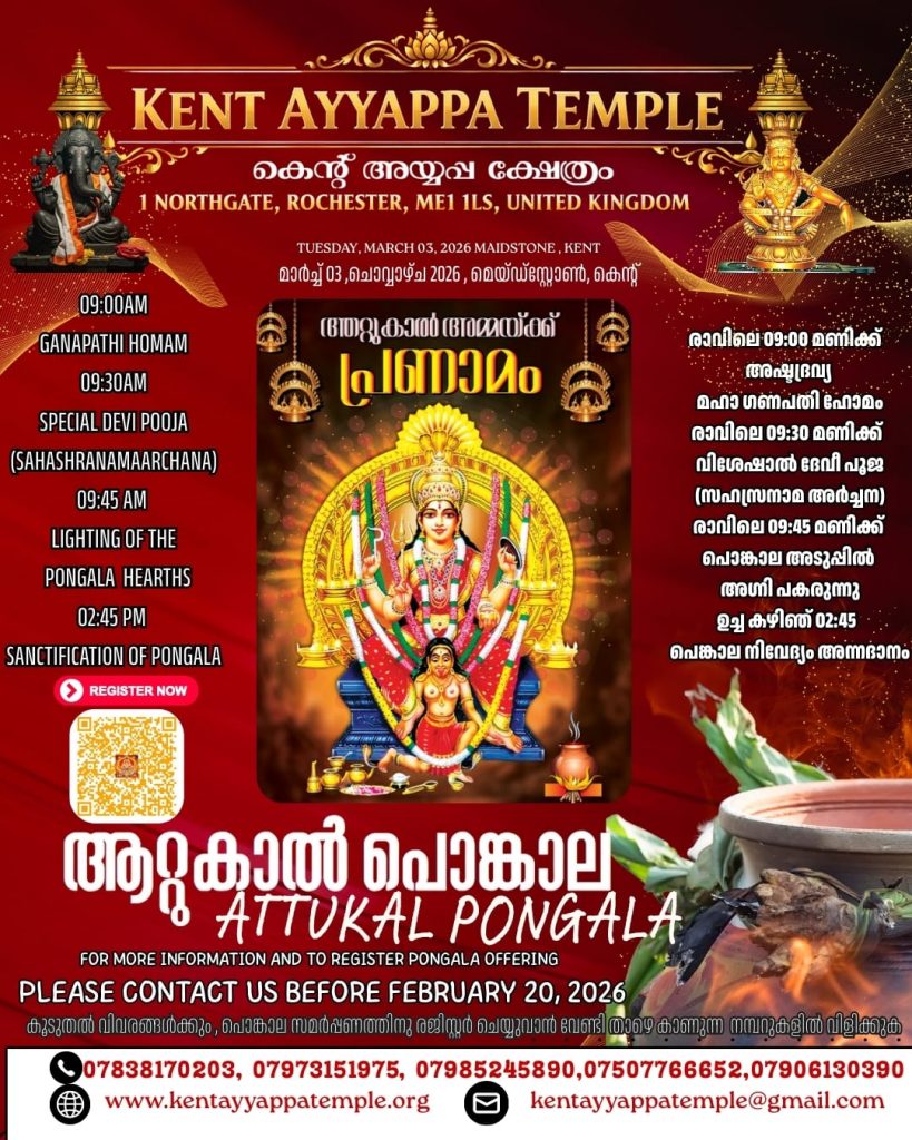ആറ്റുകാൽ പൊങ്കാലക്ക് ഒരുങ്ങി ഇംഗ്ലണ്ടിലെ കെന്റ് അയ്യപ്പ ക്ഷേത്രം 2026 മാർച്ച് 3-ാം തീയതി ചൊവ്വാഴ്ച്ച കെന്റിലെ മെയ്ഡ്സ്റ്റോൺ എന്ന സ്ഥലത്ത് വച്ചാണ് ആറ്റുകാൽ പൊങ്കാല ചടങ്ങുകൾ നടത്തപ്പെടുന്നത്. അന്നേ ദിവസം രാവിലെ 9 മണിക്ക് അഷ്ടദ്രവ്യ മഹാഗണപതീ ഹോമത്തോടെ പൂജകൾക്ക് തുടക്കമാകും തുടർന്ന് ദേവീപൂജയും,സഹ്രനാമ അർച്ചനയും ഉണ്ടാകും.9.45ന് പൊങ്കാല അടുപ്പിലേക്ക് അഗ്നിപകരും ഉച്ചക്ക് 2.45ന് പൊങ്കാല നിവേദ്യത്തോടെ പൊങ്കാല മഹോത്സവത്തിന് പരിസമാപ്ത്തിയാകും .