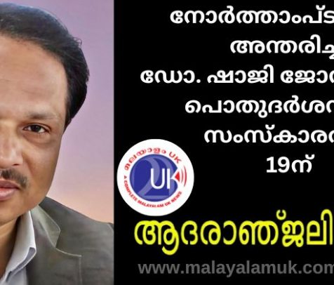 അപ്പച്ചൻ കണ്ണഞ്ചിറ നോർത്താംപ്ടൺ: പുതുവർഷ പുലരിയിൽ നോര്‍ത്താംപ്ടണില്‍ അന്തരിച്ച ഡോ. ഷാജി ജോസഫിന് മറ്റന്നാൾ, ജനുവരി 19 ന് തിങ്കളാഴ്ച യാത്രാമൊഴിയേകും. പരേതൻ കോട്ടയം കൂത്രപ്പള്ളി പടിഞ്ഞാറേ വീട്ടില്‍ കുടുംബാംഗമാണ്. നോർത്താംപ്ടണിലെ മലയാളികളുടെ പ്രിയങ്കരനായിരുന്ന ഷാജി ജോസഫ്, മികച്ച സാമൂഹ്യ പ്രവർത്തകനും, സംഘാടകനുമായിരുന്നു.ഹോമിയോപ്പതിയിൽ ബിരുദധാരിയായ ഡോ. ഷാജി നാട്ടിലും യു കെ യിലുമായി ഹോമിയോ പ്രാക്‌റ്റിസ് നടത്തിയിരുന്നു. നോർത്താംപ്ടണിലെ 'ദി കാത്തോലിക് കത്തീഡ്രൽ ഓഫ് ഔർ ലേഡി ഇമ്മാക്കുലേറ്റ് & സെന്റ് തോമസ് ഓഫ് കാന്റർബറി കത്തീഡ്രലിൽ വെച്ച് ജനുവരി 19 ന്, തിങ്കളാഴ്ച്ച രാവിലെ 11 മണിക്ക് അന്ത്യോപചാര തിരുക്കർമ്മങ്ങൾ ആരംഭിക്കും. വിശുദ്ധ കുർബ്ബാനയ്ക്ക് ശേഷം അന്ത്യാഞ്ജലി അര്‍പ്പിക്കുവാനും പൊതുദർശ്ശനത്തിനുമുള്ള അവസരം ക്രമീകരിച്ചിട്ടുണ്ട്. തുടര്‍ന്ന് മൃദദേഹം കിങ്സ്തോര്‍പ്പ് സെമിത്തരിയില്‍ എത്തിച്ച്, ഉച്ചയ്ക്ക് 2 മണിയോട് സംസ്കാര ശുശ്രുഷകൾക്ക് ശേഷം അടക്കും. പുതുവർഷ പുലരിയിൽ കുടുംബത്തെയും മലയാളിസമൂഹത്തെയും, ഏറെ വേദനിപ്പിച്ചു കൊണ്ടാണ് ഷാജിയുടെ മരണവാർത്ത അറിയുന്നത്. നോര്‍ത്താംപ്ടണ്‍ ഹോസ്പിറ്റലിൽ അഡ്മിറ്റായിരുന്ന ഡോക്ടർ ഷാജിയുടെ ആരോഗ്യനില വഷളാവുകയും തുടർന്ന് മരണപ്പെടുകയുമായിരുന്നു. അതേ ഹോസ്പിറ്റലില്‍ സ്റ്റാഫ് നഴ്‌സ് ആയിരുന്ന ഭാര്യ മിനിയും, മക്കളും മരണസമയത്ത് അരികിലുണ്ടായിരുന്നു. പരേതന്റെ ഭാര്യ മിനി ഷാജി, ഇലഞ്ഞി ഊര്‍വ്വച്ചാലില്‍ കുടുംബാംഗമാണ്. മിനി, നോർത്താംപ്ടൺ ഹോസ്പിറ്റലിലെ സീനിയര്‍ നോനാറ്റല്‍ സ്റ്റാഫ് നേഴ്‌സാണ്. ഷെല്‍വിന്‍, ഷോല്‍സിന്‍ എന്നിവർ മക്കളും, ഹെലന ഷെല്‍വിന്‍ മരുമകളുമാണ്. പരേതന് 68 വയസ്സ് പ്രായമായിരുന്നു. കുടുംബ നാഥന്റെ ആകസ്മിക മരണം ദുംഖത്തിലാഴ്ത്തിയ കുടുംബത്തിനു സാന്ത്വനവും, സഹായവുമായി വൈദികരായ സെബാസ്റ്റ്യന്‍, ബെന്നിയച്ചന്‍, മലയാളി സമൂഹം, ബന്ധു മിത്രാദികള്‍, സഹപ്രവര്‍ത്തകര്‍ തുടങ്ങിയവരുടെ സ്നേഹോഷ്മളമായ സാന്നിദ്ധ്യം ഉണ്ടായിരുന്നത് കുടുംബത്തിന് ഏറെ ആശ്വാസമേകി. പ്രിയ സഹോദരന് വിടചൊല്ലുവാനും, പ്രാർത്ഥനകൾ നേരുവാനും, ദുംഖാർത്തരായ കുടുംബാംഗങ്ങൾക്ക് സാന്ത്വനമേകുവാനും യു കെ യുടെ നാനാഭാഗങ്ങളിൽ നിന്നും വലിയൊരു സമൂഹം എത്തിച്ചേരുമെന്നതിനാൽ വിപുലമായ സൗകര്യങ്ങൾ ഒരുക്കിയിട്ടുണ്ട്. Cathedral Address: The Catholic Cathedral of Our Lady Immaculate & St Thomas of Canterbury, Kingsthorpe Rd, Primrose Hill, Northampton NN2 6AG. ( Time 11 AM Cemetery Address: Kingsthorpe Cemetery, NN2 8LU (Time 2 PM )