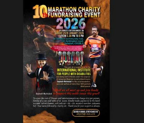 മാരത്തോൺ റണ്ണർ ശ്രീ അശോക് കുമാർ സംഘടിപ്പിക്കുന്ന 10-ാമത് മാരത്തോൺ ചാരിറ്റി ഫണ്ട് റൈസിംഗ് ഇവന്റ് ഈ വരുന്ന ഞായറാഴ്ച (25/ 01/26) സെൽസ് ഡൺ കമ്മ്യൂണിറ്റി സെന്ററിൽ വച്ചു നടത്തപ്പെടുന്നു. മാരത്തോൺ ചരിത്രത്തിൽ കുറഞ്ഞ കാലയളവിൽ ആറ് മേജർ മാരത്തോണുകൾ പൂർത്തിയാക്കിയ ലോകത്തിലെ ആദ്യ മലയാളിയായ അശോക് കുമാർ സംഘടിപ്പിക്കുന്ന 10-ാമത്തെ ഇവന്റാണ്. വൈകുന്നേരം 3.30 മുതൽ വിവിധ കലാപരിപാടികളോടു കൂടി ആരംഭിക്കുന്ന പരിപാടിയിൽ ക്രോയ്ഡോൺ മേയറും, സിവിക് മേയറും മറ്റ് വിശിഷ്ടാതിഥികളും പങ്കെടുക്കുo. ചാരിറ്റി ഇവന്റിലൂടെ ഇതുവരെ 45000 ൽ അധികം പൗണ്ട് സമാഹരിക്കുകയും അത് വിവിധ ചാരിറ്റികൾക്ക് നൽകുകയും ചെയ്തു. ഈ വർഷത്തെ ഇവന്റിലൂടെ ലഭിക്കുന്ന തുക പ്രശസ്ത മജീഷ്യൻ ശീ ഗോപിനാധ് മുതുകാടിന്റെ നേതൃത്വത്തിൽ നടത്തുന്ന ഇന്റർ നാഷണൽ ഇൻസ്റ്റിറ്റ്യൂട്ട് ഫോർ പീപ്പിൾ വിത്ത് ഡി സെബിലിറ്റീസ് എന്ന പ്രസ്താനത്തിന്റെ പുരോഗതിക്കായാണ് നൽകുന്നത്. തന്റെ 53-ാമത്തെ വയസ്സിൽ 2014 ൽ ലണ്ടൻ മാരത്തോണിലൂടെ തുടക്കം കുറിച്ച അശോക് കുമാർ രണ്ടര വർഷം കൊണ്ടാണ് ലോകത്തിലെ പ്രമുഖ ആറ് മേജർ മാരത്തോണുകൾ ഉൾപ്പെടെ 19 മാരത്തോണുകൾ ഓടി പൂർത്തിയാക്കിയത്.