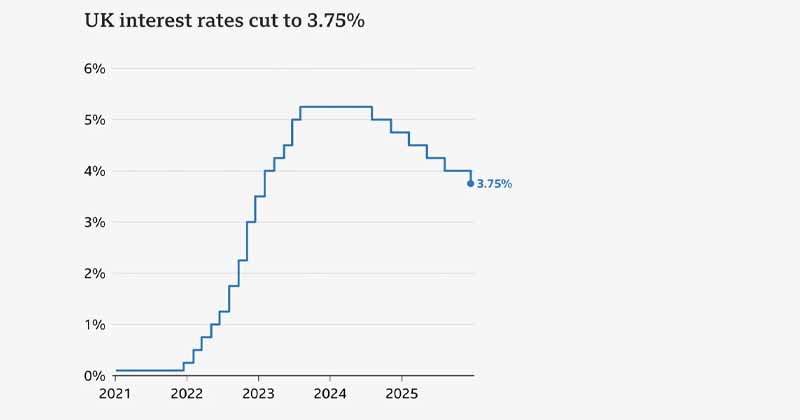 ബ്രിട്ടനിലെ കേന്ദ്ര ബാങ്കായ ബാങ്ക് ഓഫ് ഇംഗ്ലണ്ട് അടിസ്ഥാന പലിശനിരക്ക് 4 ശതമാനത്തിൽ നിന്ന് 3.75 ശതമാനമായി കുറച്ചു. 2023 തുടക്കത്തിന് ശേഷമുള്ള ഏറ്റവും താഴ്ന്ന നിരക്കാണിത്. പണപ്പെരുപ്പം നിയന്ത്രണത്തിലേക്ക് വരുന്നതായ വിലയിരുത്തലിന്റെ അടിസ്ഥാനത്തിലാണ് തീരുമാനമെന്ന് ബാങ്ക് വ്യക്തമാക്കി. ഒൻപത് അംഗങ്ങളുള്ള മോണിറ്ററി പോളിസി കമ്മിറ്റിയിൽ 5–4 എന്ന ഭൂരിപക്ഷത്തിലാണ് പലിശനിരക്ക് കുറയ്ക്കാൻ തീരുമാനമായത്.