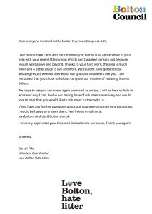 ബോൾട്ടനിലെ തെരുവ് ശുചീകരണവുമായി ബന്ധപ്പെട്ട് കൗൺസിലിന്റെ കീഴിൽ പ്രവർത്തിക്കുന്ന ‘ലവ് ബോൾട്ടൻ, ഹേറ്റ് ലിറ്റർ’ സംവിദാനത്തിന്റെ മേൽനോട്ടവും ചുമതലയും വഹിക്കുന്ന ഉദ്യോഗസ്ഥനായ (വോളന്റീയർ കോർഡിനേറ്റർ) ഗാരത്ത് പൈക്കാണ് സേവാ ദിനത്തിന്റെ ഭാഗമായ ഐ സി വോളന്റിയർമാരെ അഭിനന്ദിച്ചുകൊണ്ടുള്ള കത്ത് കൈമാറിയത്. ഐ സിയുടെ വനിതാ – യുവജന പ്രവർത്തകരടക്കം 22 ‘സേവ വോളന്റിയർ’മാരാണ് ശുചീകരണ പ്രവർത്തനങ്ങളിൽ പങ്കെടുത്തത്.
