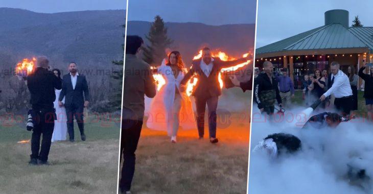 വെഡ്ഡിംഗ് ഫോട്ടോഗ്രഫറായ റസ് പവല് ആണ് വീഡിയോ ഇന്സ്റ്റഗ്രാമില് പങ്ക് വച്ചിരിക്കുന്നത്. ‘വെന് സ്റ്റണ്ട് പീപ്പിള് മാരി’ എന്നാണ് വീഡിയോയുടെ ക്യാപ്ഷന്. വീഡിയോയ്ക്ക് സമ്മിശ്ര പ്രതികരണമാണ് സമൂഹമാധ്യമങ്ങളില് ലഭിക്കുന്നത്. ക്യാമറാമാന് ഇരുവരുടെയും നടത്തം ഷൂട്ട് ചെയ്യാന് മറന്ന് പോയിരുന്നെങ്കിലോ എന്നും ഒരു കല്യാണം കഴിയ്ക്കാന് സ്ഥലം മുഴുവന് കത്തിച്ചു എന്നുമൊക്കെയാണ് വീഡിയോയ്ക്ക് താഴെ വരുന്ന കമന്റുകള്.