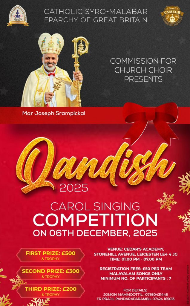 യുകെയിലെ സീറോ മലബാർ രൂപതയുടെ ചർച്ച് ക്വയർ കമ്മീഷൻ സംഘടിപ്പിക്കുന്ന ഓൾ യുകെ കരോൾ ഗാനമത്സരം “ 2025” ഡിസംബർ 6-ന് ലെസ്റ്ററിലെ Cedar’s Academy യിൽ നടക്കും. ഉച്ചയ്ക്ക് 1 മണിമുതൽ ആരംഭിക്കുന്ന ഈ സംഗീത മാമാങ്കം, ക്രിസ്മസിനെ പുതുമയോടെ ആഘോഷിക്കുന്നതിനും സമൂഹത്തെ ഒന്നിപ്പിക്കുന്നതിനുമുള്ള വേദിയാകും.