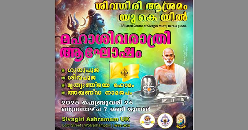 മഹാശിവരാത്രി ദിനമായ 2025 ഫെബ്രുവരി 26 ന് ബുധനാഴ്ച ശിവഗിരി ആശ്രമം യുകെയിൽ “മഹാശിവരാത്രി ” സമു ചിതമായി ആഘോഷിക്കുന്നു. കുംഭ മാസത്തിലെ കൃഷ്ണപ ക്ഷത്തിലെ പതിമൂന്നാം രാത്രിയും പതിനാലാം പകലുമാണ് ശിവരാത്രി ആഘോഷിക്കുന്നത്.