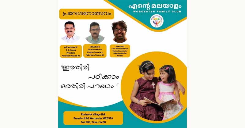 വൂസ്റ്റർ : ഇംഗ്ലണ്ടിലെ വൂസ്റ്ററിൽ സജീവമായി പ്രവർത്തിച്ചുകൊണ്ടിരിക്കുന്ന വൂസ്റ്റർ ഫാമിലി ക്ലബ്ബിന്റെ ആഭിമുഖ്യത്തിൽ ആരംഭിക്കുന്ന മലയാളം സ്കൂളിന്റെ ഔപചാരികമായ ഉദ്ഘാടനം നാളെ (ശനി) 2 പി എമ്മിന് മലയാളം മിഷൻ യു കെ ചാപ്റ്റർ പ്രസിഡന്റും ലോക കേരളസഭാംഗവുമായ സി എ ജോസഫ് നിർവ്വഹിക്കും. മലയാളം മിഷൻ യുകെ ചാപ്റ്റർ സെക്രട്ടറി എബ്രഹാം കുര്യൻ, ലോക കേരള സഭാംഗവും, റീജീയണൽ കോർഡിനേറ്ററുമായ ആഷിക്ക് മുഹമ്മദ് നാസർ എന്നിവർ ആശംസകൾ നേർന്ന് സംസാരിക്കും. വൂസ്റ്റർ ഫാമിലി ക്ലബ് പ്രസിഡന്റ് ജോബിൾ ജോസിന്റെ അധ്യക്ഷതയിൽ ചേരുന്ന സമ്മേളനത്തിൽ ഫാമിലി ക്ലബ് സെക്രട്ടറി ബിബിൻ കെ ജോയ് സ്വാഗതവും ജോയിന്റ് സെക്രട്ടറി സവിത രവീന്ദ്രൻ കൃതജ്ഞതയും പറയും.