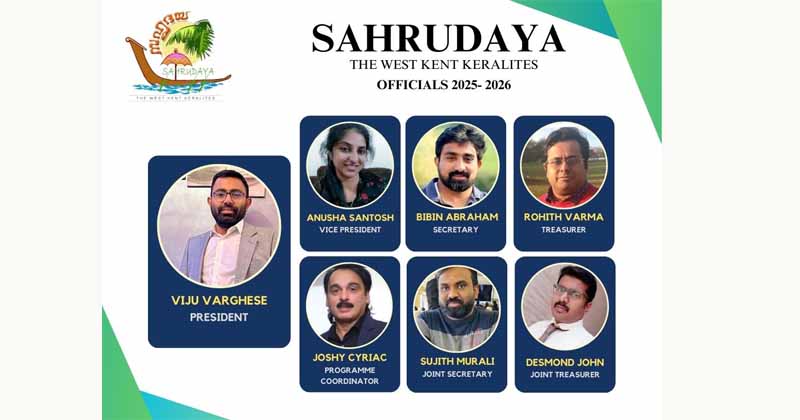ഫെബ്രുവരി മാസം എട്ടാം തീയതി ശനിയാഴ്ച്ച ടൺ ബ്രിഡ്ജ് വെൽസിലെ മാറ്റ് ഫീൾഡ് ഹാളിൽ വെച്ചു നടന്ന വാര്ഷിക പൊതുയോഗത്തിലാണ് സഹൃദയുടെ 2025- 2026 വർഷത്തേക്കുള്ള പുതു നേതൃത്വത്തെ ഏകകണ്ഠമായി തിരഞ്ഞെടുത്തത്.