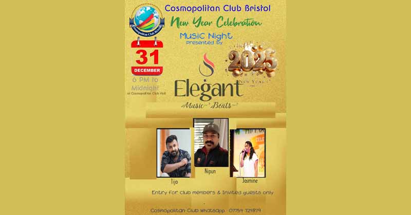 യു കെയിലെ ബ്രിസ്റ്റൾ വിച്ച്ചർച്ച് കേന്ദ്രമാക്കി പ്രവർത്തിക്കുന്ന യൂറോപ്പിലെ പ്രമുഖ കലാ സാംസ്കാരിക സംഘടനയായ കോസ്മോപൊലിട്ടൻ ക്ലബ്ബിന്റെ പുതുവത്സര ആഘോഷത്തോടനുബന്ധിച്ചു നടക്കുന്ന ചടങ്ങിൽ “എലെഗന്റ് മ്യൂസിക് ബീറ്റ്സ് ” എന്ന പുതിയ മ്യൂസിക് ട്രൂപ്പിന്റെ ഉദ്ഘാടനം കോസ്മോപൊളിട്ടൻ ക്ലബ്ബിന്റെ പ്രസിഡന്റ് ശ്രീ ജോസ് മാത്യു നിർവഹിക്കും. യു കെ മലയാളികളായ നിപുൺ പോൾ, ടിജോ, ജാസ്മിൻ എന്നിവരുടെ നേതൃത്വത്തിൽ ആണ് ഈ സംഗീത കൂട്ടായ്മ.