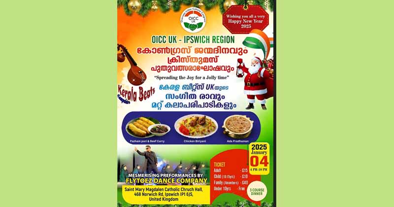 ഓ ഐ സി സി (യു കെ) ഇപ്സ്സ്വിച്ച് റീജിയന്റെ ആഭിമുഖ്യത്തിൽ ഇന്ത്യൻ നാഷണൽ കോൺഗ്രസ് പാർട്ടിയുടെ 140 – മത് ജന്മദിനാഘോഷം രാജ്യസ്നേഹം വിളിച്ചോതുന്നതായി. ഇപ്സ്വിച്ച് മേരി മഗ്ധലീൻ പള്ളി ഹാളിൽ വച്ച് ജനുവരി 4ന് റീജിയന്റെ ക്രിസ്തുമസ് – ന്യൂ – ഇയർ ആഘോഷങ്ങളോടൊപ്പം സംയുക്തമായാണ് പരിപാടി സംഘടിപ്പിക്കപ്പെട്ടത്.