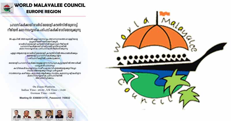 ലോകത്തിന്റെ വിവിധഭാഗങ്ങളിലായി കഴിയുന്ന മലയാളികൾക്കായി ഏപ്രിൽ 28ന് മുതൽ എല്ലാ മാസത്തിന്റയും അവസാന വെള്ളിയാഴ്ച വേൾഡ് മലയാളി കൗൺസിൽ യൂറോപ്പ് റീജിയൻ കലാസംസ്കാരിക വേദിയൊരുക്കുന്നു. ഏപ്രിൽ 28ന് ഉച്ചകഴിഞ്ഞു മൂന്നു മണിക്കു (യു കെ സമയം )സൂം പ്ലാറ്റ്ഫോമിലൂടെ നടത്തപ്പെടുന്ന ഈ കലാസംസ്കാരിക വേദിയിൽ എല്ലാ പ്രവാസി മലയാളികൾക്കും അവർ താമസിക്കുന്ന രാജ്യങ്ങളിൽ നിന്നുകൊണ്ട് ഇതിൽ പങ്കെടുക്കുവാനും, അവരുടെ കലാസൃഷ്ട്ടികൾ അവദരിപ്പിക്കാനും, ആശയ വിനിമയം നടത്താനും അവസരം ഉണ്ടായിരിക്കുന്നതാണ്.