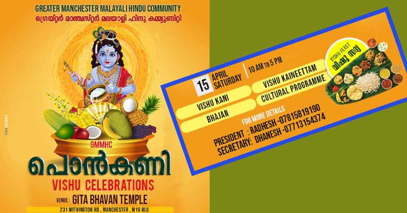 യുകെയിലെ പ്രശസ്തമായ ഗ്രെയ്റ്റര് മാഞ്ചസ്റ്റര് മലയാളി ഹിന്ദു കമ്മ്യൂണിറ്റിയുടെ പ്രൗഢ ഗംഭീരമായ വിഷു മഹോത്സവം പൂര്വ്വാധികം ഭംഗിയായി അഘോഷിക്കുവാന് മാഞ്ചസ്റ്റർ ഒരുങ്ങുകയാണ്. 2023 ഏപ്രിൽ 15നു ശനിയാഴ്ച രാവിലെ 10 മുതല് വൈകിട്ട് 6 മണി വരെ മാഞ്ചസ്റ്ററില് ഗീത ഭവൻ ക്ഷേത്രത്തിൽ വെച്ച് ഭക്ത്യാദരപൂര്വ്വം ആഘോഷിക്കപ്പെടും.