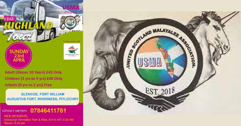 യുണൈറ്റഡ് സ്കോട്ട്ലാൻഡ് മലയാളി അസോസിയേഷൻ (USMA) വേൾഡ് മലയാളി കൗൺസിൽ (WMC) സ്കോട്ട്ലാൻഡ് റീജിയനുമായി സഹകരിച്ച് ഹൈലാൻഡിലേക്ക് ഏകദിന ടൂർ നടത്തുന്നു. ഏപ്രിൽ 23 ഞായറാഴ്ച എഡിൻബർഗ് ഹെർമിസ്റ്റൺ പാർക്കിൽ നിന്നും (EH14 4AT) രാവിലെ8.30 ന് പര്യടനം ആരംഭിക്കുന്നു. റിപ്പോർട്ടിംഗ് സമയം രാവിലെ 8.15. രാത്രി 9.30ഓടെ മടങ്ങിയെത്താനാണ് പദ്ധതിയിട്ടിരിക്കുന്നത്.