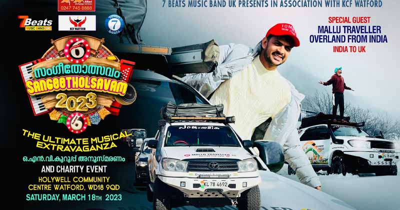 ലണ്ടൻ:യുകെ മലയാളികളുടെയിടയിൽ ജനശ്രദ്ധ നേടിയ 7 ബീറ്റ്സ് സംഗീതോത്സവം സീസൺ -6 & ചാരിറ്റി ഈവെന്റ്റ് കഴിഞ്ഞ അഞ്ചുവർഷത്തെ വൻ വിജയത്തിനുശേഷം ഇതാ മൂന്നാം തവണയും കേരളാ കമ്മ്യൂണിറ്റി ഫൌണ്ടേഷൻ ചാരിറ്റി ട്രസ്റ്റ് (KC F) വാട്ട്ഫോർഡിന്റെ പരിപൂർണ്ണ സഹകരണത്തോടെ ലണ്ടനോടടുത്ത പ്രധാന നഗരങ്ങളിലൊന്നായ വാട്ട് ഫോർഡിൽ സീസൺ 6- വിപുലമായ ഒരുക്കങ്ങളോടെ മാർച്ച് 18 ശനി 3 മണിമുതൽ രാത്രി 10 വരെ വീണ്ടും എത്തുന്നു.