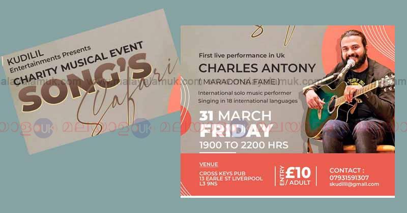 മാർച്ച് 31ന് ചാൾസ് ആന്റണി, യുകെയിലെ പ്രശസ്ഥ കുടിലിൽ സ്റ്റുഡിയോയുടെ ചാരിറ്റി ഇവന്റ്ൽ യുകെയിൽ ആദjമായി ലൈവ് പെർഫോമൻസ് നടത്തുന്നു.ലിവർപൂളിലെ ക്രോസ്സ് കി പബിൽ വച്ചാണ് പെർഫോമൻസ് നടത്തപ്പെടുന്നത്.