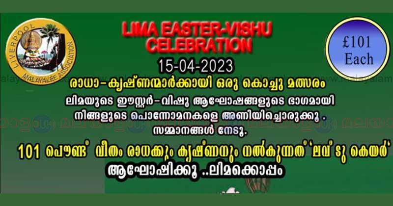 ലിവർപൂൾ മലയാളി അസോസിയേഷൻ ലിവർപൂളിൽ ലിമയുടെ 2023 വർഷത്തിലെ ഈസ്റ്റർ,വിഷു ആഘോഷങ്ങളോട് അനുബന്ധിച്ച് 10 വയസ്സ് വരെ ഉള്ള കുട്ടികളുടെ രാധ, കൃഷ്ണ ഫാൻസിഡ്രെസ്സ് മത്സരം നടത്തപെടുന്നു. മത്സരത്തിലെ വിജയി ആകുന്ന ക്യൂട്ട് രാധയ്ക്കും, ക്യൂട്ട് കൃഷ്ണനും 101 പൗണ്ട് വീതം സമ്മാനം നൽകുന്നത് ലവ് റ്റു കെയർ നഴ്സിംഗ് ആൻഡ് റീക്യൂർട്ട്മെന്റ് ഗ്രൂപ്പ് ആണ്.