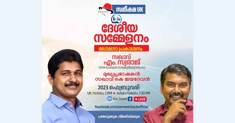 സമീക്ഷ യു.കെ ആറാം ദേശീയ സമ്മേളന ലോഗോ പ്രകാശനം CPI(M) സംസ്ഥാന സെക്രട്ടറിയേറ്റംഗം സ.എം.സ്വരാജ് നിർവ്വഹിച്ചു. യു.കെ യിൽ നിന്നും,ലോകത്തിൻ്റെ വിവിധ കോണുകളിൽ നിന്നുമായി പങ്കെടുത്ത നിരവധി പേരുടെ നിറഞ്ഞ സാന്നിദ്ധ്യത്തിലായിരുന്നു സൂമിലൂടെയുള്ള പ്രകാശന കർമ്മം നിർവ്വഹിക്കപ്പെട്ടത്.