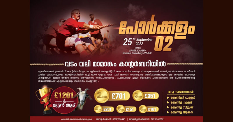 കാന്റർബെറി : എവർഷൈൻ ബ്രദേഴ്സ് കാന്റർ ബറിയും , കാന്റർ ബറി മലയാളി അസോസിയേഷനും സംയുക്തമായി നടത്തുന്ന പോർക്കളം -2 വടംവലി മത്സരം സെപ്റ്റംബർ 25 ന് നടക്കും , യു കെ യുടെ ചരിത്രത്തിലെ ഏറ്റവും വലിയ സമ്മാനത്തുക നൽകുന്ന മത്സരത്തിന്റെ ഒരുക്കങ്ങൾ പൂർത്തിയായി വരുന്നതായി സംഘാടക സമിതി അറിയിച്ചു . മത്സരത്തോടനുബന്ധിച്ച് കേരള തനിമയാർന്ന കലാരൂപങ്ങളും അരങ്ങേറും . മുഖ്യാതിഥി ആയി എത്തുന്ന കാന്റർബറി മേയറെ വാദ്യഘോഷങ്ങളുടെ അകമ്പടിയോടെ മാവേലിത്തമ്പുരാനോടൊപ്പം വരവേൽക്കും .നാടൻ ഭക്ഷണവും അതിഥികൾക്കായി ക്രമീകരിച്ചിട്ടുണ്ട് .