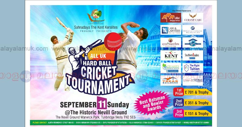 കെന്റിലെ പ്രമുഖ മലയാളി അസോസിയേഷനായ സഹൃദയ ദി കെന്റ് കേരളൈറ്റ്സ് അണിയിച്ചൊരുക്കുന്ന മൂന്നാമത്തെ ഓൾ യു.കെ ഹാർഡ് ബോൾ ക്രിക്കറ്റ് ടൂർണ്ണമെന്റ് സെപ്റ്റംബർ പതിനൊന്ന് ഞായറാഴ്ച്ച ഇന്ത്യൻ ക്രിക്കറ്റ് ചരിത്രം കോറിയിട്ടിരിക്കുന്ന പ്രശസ്തമായ നെവിൽ ക്രിക്കറ്റ് ഗ്രൗണ്ടിൽ വെച്ച് നടത്തപ്പെടും.