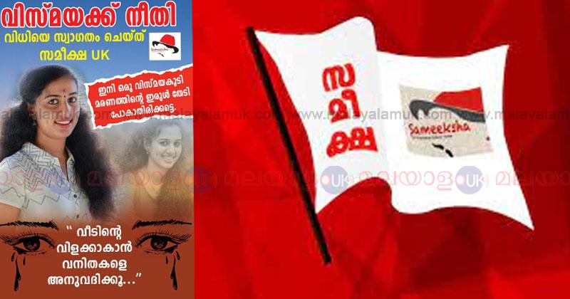 ലണ്ടൻ : കേരളത്തെ മുഴുവൻ കണ്ണീരിൽ മുക്കിയ വിസ്മയ കേസിന്റെ വിധിയിൽ സമീക്ഷ യുകെ സർവ്വാത്മനാ സ്വാഗതം ചെയ്തു. 2021 ജൂൺ 21 ന് നിലമേൽ സ്വദേശിയും ബി.എ.എം.എസ് മെഡിക്കൽ വിദ്യാർത്ഥിനിയുമായ വിസ്മയയെ സ്ത്രീധന ഗാർഹിക പീഡനത്തെ തുടർന്ന് കൊല്ലം പോരുവഴിയിലെ ഭർത്തൃഗൃഹത്തിൽ ഉണ്ടായ ആത്മഹത്യയാണ് കേസിന് ആസ്പദമാക്കിയ സംഭവം. 2020 മെയ് 30 ന് ആയിരിന്നു വിസ്മയയും അസി: മോട്ടോർ വെഹിക്കിൾ ഇൻസ്പെക്ടർ കിരൺകുമാറുമായുള്ള വിവാഹം. വിസ്മയയുടെ മരണത്തിനു തൊട്ടുപിന്നാലെ കിരൺകുമാറെ സർവ്വീസിൽ നിന്നും പിരിച്ചു വിട്ടു .42 സാക്ഷികൾ, 102സാക്ഷിമൊഴികൾ, 118 രേഖകൾ, 500 ഡിജിറ്റൽ തെളിവുകൾ, 12 തൊണ്ടി മുതലുകൾ എല്ലാം തന്നെ കോടതി തെളിവായി സ്വീകരിച്ചു .വെറും 80 ദിവസം കൊണ്ട് കുറ്റപത്രം സമർപ്പിക്കാൻ അന്വേഷക സംഘത്തിന് കഴിഞ്ഞു. 4 മാസം നീണ്ടു നിന്ന വിചാരണക്കുശേഷം വിസ്മയ മരിച്ചിട്ട് കേവലം11 മാസവും 2 ദിവസവും പൂർത്തിയാകുമ്പോൾ 507 പേജുള്ള വിധിയിലൂടെ കൊല്ലം ഒന്നാം ക്ലാസ്സ് അഡീഷണൽ സെഷൻസ് കോടതി പ്രതിക്ക് 10 വർഷം തടവും 12ലക്ഷം 5000 രൂപ പിഴയും അടക്കണമെന്ന മാതൃകാപരമായ ശിക്ഷ യാണ് പ്രതിക്ക് നൽകിയത് .