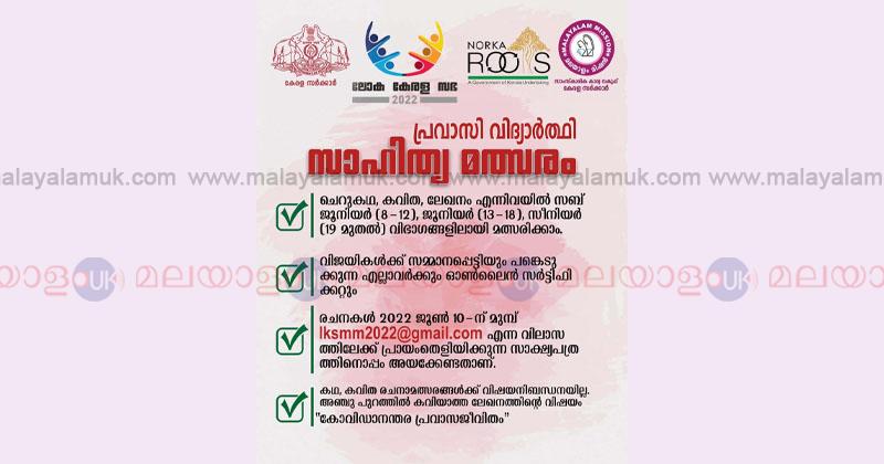 ലണ്ടൻ: 2022 ജൂൺ 17,18 തീയതികളിൽ തിരുവനന്തപുരത്തു നടക്കുന്ന ലോകകേരളസഭയോടനുബന്ധിച്ച് പ്രവാസ സാഹിത്യ രംഗത്തെ പുതിയ പ്രതിഭകളെ കണ്ടെത്താന് ലോകകേരളസഭ പ്രവാസ സാഹിത്യ മത്സരം ഒരുക്കുന്നു. മലയാളം മിഷന് ഒരുക്കുന്ന ഈ മത്സരത്തില് ചെറുകഥ, കവിത, ലേഖനം എന്നിവയില് സബ് ജൂനിയര് (വയസ് 8-12), ജൂനിയര്(വയസ് 13-18), സീനിയര് (വയസ് 19 മുതല്) വിഭാഗങ്ങളിലായി പ്രവാസി വിദ്യാര്ത്ഥികള്ക്ക് മത്സരിക്കാം. രചനകള് 2022 ജൂണ് 10-ന് മുമ്പ് [email protected] എന്ന വിലാസത്തിലേക്ക് പ്രായം തെളിയിക്കുന്ന സാക്ഷ്യപത്രത്തിനൊപ്പം വിദ്യാർത്ഥിയാണെന്ന് തെളിയിക്കുന്ന സ്വയം സാക്ഷ്യപെടുത്തിയ കത്തും രചനയ് ക്കൊപ്പം അയക്കേണ്ടതാണ്.