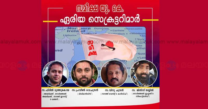 സംഘടനയുടെ സുഖമമായ പ്രവർത്തനത്തിന് ബ്രാഞ്ചുകളെ ഏരിയകൾ ആക്കി തിരിച്ചു കൊണ്ട് ഒരോ ഏരിയകൾക്കും സമീക്ഷയുകെ ഏരിയ സെക്രട്ടറിമാരെ തീരുമാനിച്ചു. സഖാവ് പ്രവീൺ രാമചന്ദ്രൻ സഖാവ് ജിൻസ്സ് തയ്യിൽ ,സഖാവ് വിനു ചന്ദ്രൻ, സഖാവ് ഫിദിൽ മുത്തുകോയ എന്നിവരാണ് ഏരിയ സെക്രട്ടറിമാർ.