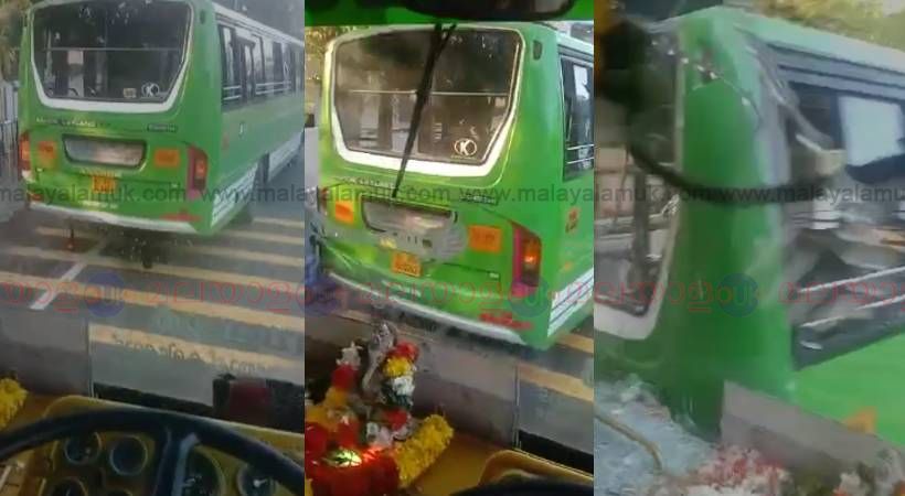 ഇന്ന് രാവിലെ എട്ട് മണിയോടെ ആയിരുന്നു സംഭവം. ഓട്ടത്തിന്റെ സമയം സംബന്ധിച്ചായിരുന്നു തർക്കം. ഇതിന് പിന്നാലെ ഇരു ബസിലെ ജീവനക്കാരും അതത് ബസിൽ കയറി. എന്നാൽ മുന്നോട്ട് എടുത്ത ബസ് പിന്നിലോട്ട് എടുത്ത് ഇടിക്കുകയായിരുന്നു. ഇടിയിൽ ബസിന്റെ മുന്നിലെ ചില്ല് തകർന്നു.