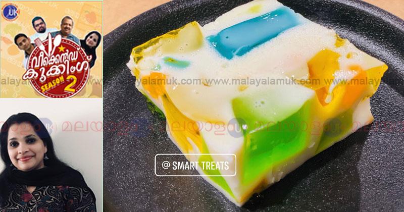 അതിനായി ഓരോ ജെല്ലോ ഫ്ലേവറും ഓരോ കപ്പ് ചൂടുവെള്ളത്തിൽ ലയിപ്പിച്ചു, വെവ്വേറെ കണ്ടെയ്നറുകളിൽ സെറ്റ് ചെയ്യാനായി, ഏകദേശം 1 മണിക്കൂർ ഫ്രിഡ്ജിൽ വെക്കുക.