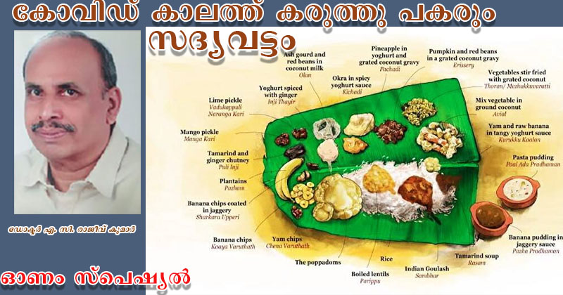 ആനുകാലിക ആരോഗ്യ പ്രതിസന്ധി മറികടക്കാൻ പര്യാപ്തമായ വിഭവങ്ങൾ ആണല്ലോ സദ്യയിലുള്ളത്. മനുഷ്യാരോഗ്യം നിലനിർത്തുവാൻ ആവശ്യമായ ഭക്ഷ്യ പോഷകങ്ങളും ധാതു ലവണങ്ങളും നിറയെ ഉള്ള സസ്യ സമ്പത്ത് ഏറെ ഉപയോഗപ്പെടുത്തുന്ന സദ്യവിഭവങ്ങൾ തൂശനിലയിൽ ഒരു പാതി ആരോഗ്യ രക്ഷാകരമായ ഉപദംശങ്ങൾ -കൂട്ടാൻ – മറു പാതിയിൽ ഊർജദായകമായ അന്നവും. ഇലയിലുതിരുന്ന സസ്യ സമ്പത്തും.