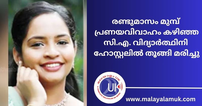 നവവധുവിനെ കോട്ടയം നഗരത്തിലെ ഹോസ്റ്റലില് തൂങ്ങിമരിച്ചനിലയില് കണ്ടെത്തി. മുണ്ടക്കയം ഇളംകാട് വലിയപുരയ്ക്കല് ശ്രുതിമോള്(26) ആണ് മരിച്ചത്. സി.എ.വിദ്യാര്ഥിനിയായിരുന്നു.