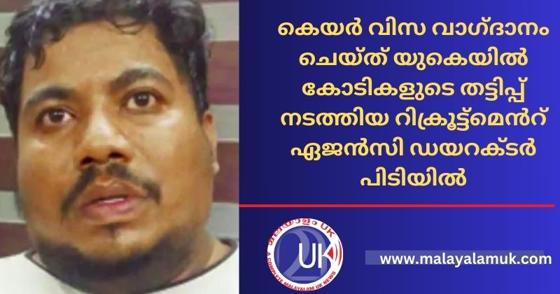 യു.കെ.യില് കെയറര് വിസ വാഗ്ദാനംചെയ്ത് കോടിക്കണക്കിന് രൂപയുടെ തട്ടിപ്പ് നടത്തിയ കേസില് റിക്രൂട്ട്മെന്റ് ഏജന്സി ഡയറക്ടര് അറസ്റ്റില്. കണ്ണൂര് ഗോപാല് സ്ട്രീറ്റിലെ സ്റ്റാര്നെറ്റ് ഇന്റര്നാഷണല് പ്രൈവറ്റ് ലിമിറ്റഡിന്റെ ഡയറക്ടര് പയ്യാവൂര് കാക്കത്തോട് സ്വദേശി പെരുമാലില് പി.കെ.മാത്യൂസ് ജോസി(31) നെയാണ് തളിപ്പറമ്പില്നിന്ന് കണ്ണൂര് എ.സി.പി. കെ.വി.വേണുഗോപാലിന്റെ നേതൃത്വത്തിലുള്ള പോലീസ് സംഘം അറസ്റ്റുചെയ്തത്. സ്ഥാപനം പോലീസ് പൂട്ടി.