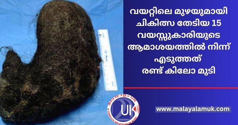 വയറ്റിൽ മുഴയുമായി കോഴിക്കോട് മെഡിക്കൽ കോളേജിൽ ചികിത്സ തേടിയ 15കാരിയുടെ ആമാശയത്തിൽ നിന്ന് പുറത്തെടുത്തത് രണ്ട് കിലോ മുടി. കഴിഞ്ഞ എട്ടാം തീയതിയാണ് പാലക്കാട് സ്വദേശിയായ പത്താംക്ലാസുകാരിയെ മെഡിക്കൽ കോളേജിൽ പ്രവേശിപ്പിച്ചത്. സി.ടി സ്കാനിംഗിൽ മുഴ ദൃശ്യമായി. എൻഡോസ്കോപ്പിയിൽ ആമാശയത്തിൽ ഭീമൻ മുടിക്കെട്ടാണെന്ന് കണ്ടെത്തുകയായിരുന്നു.
