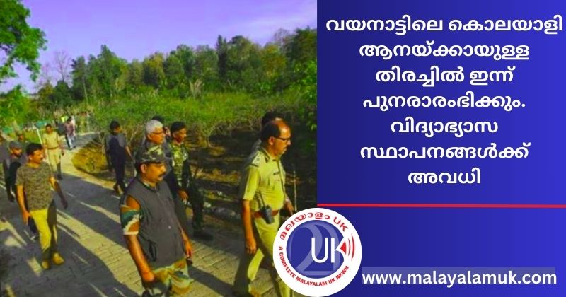 അതേസമയം, കാട്ടാനയുടെ സാന്നിധ്യമുള്ളതിനാല് സുരക്ഷാകാരണങ്ങള് മുന്നിര്ത്തി തിരുനെല്ലി പഞ്ചായത്തിലേയും മാനന്തവാടി നഗരസഭയിലെ നാല് ഡിവിഷനുകളിലേയും വിദ്യാഭ്യാസ സ്ഥാപനങ്ങള്ക്ക് ജില്ലാകളക്ടര് അവധി പ്രഖ്യാപിച്ചു. നഗരസഭയിലെ കുറുക്കന് മൂല (12), കുറുവ (13), കാടംകൊല്ലി (14), പയ്യമ്പള്ളി (15) ഡിവിഷനുകളിലാണ് അവധി.