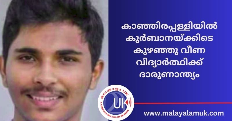 കാഞ്ഞിരപ്പള്ളിയിൽ കുർബാനയ്ക്കിടെ പ്ലസ് വൺ വിദ്യാർഥി കുഴഞ്ഞുവീണു മരിച്ചു. ആനക്കല്ല് സെന്റ് ആന്റണീസ് ദേവാലയത്തിൽ ഞായറാഴ്ച കുർബാനയ്ക്കിടെയായിരുന്നു സംഭവം. ആനക്കല്ല് നെല്ലിക്കുന്നേൽ അഡ്വ. പോൾ ജോസഫിന്റെ മകൻ മിലൻ പോൾ (16) ആണ് മരിച്ചത്. രാവിലെ ഏഴുമണിയോടെയായിരുന്നു സംഭവം. ഇടവകയിലെ ആൾത്താര ബാലനായിരുന്നു.
