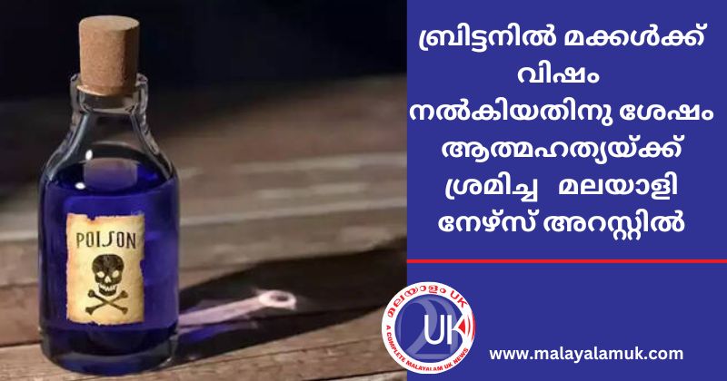 ബ്രിട്ടനിൽ മക്കൾക്ക് വിഷാംശമുളള രാസവസ്തു നൽകി ആത്മഹത്യയ്ക്ക് ശ്രമിച്ച നഴ്സായ മലയാളി യുവതി പിടിയിൽ. പതിമൂന്നും എട്ടും വയസുളള മക്കൾക്ക് വിഷം നൽകിയ ശേഷമാണ് ജിലുമോൾ ജോർജ് (38) ആത്മഹത്യയ്ക്ക് ശ്രമിച്ചത്. കുട്ടികളുടെ ശരീരത്തിൽ യുവതി വിഷാംശമുള്ള രാസവസ്തു കുത്തിവയ്ക്കുകയായിരുന്നുവെന്നാണ് ലഭിക്കുന്ന വിവരം. വ്യാഴാഴ്ച രാവിലെയായിരുന്നു സംഭവം. ജിലുവിന്റെ ഭർത്താവ് നാട്ടിലാണ്.