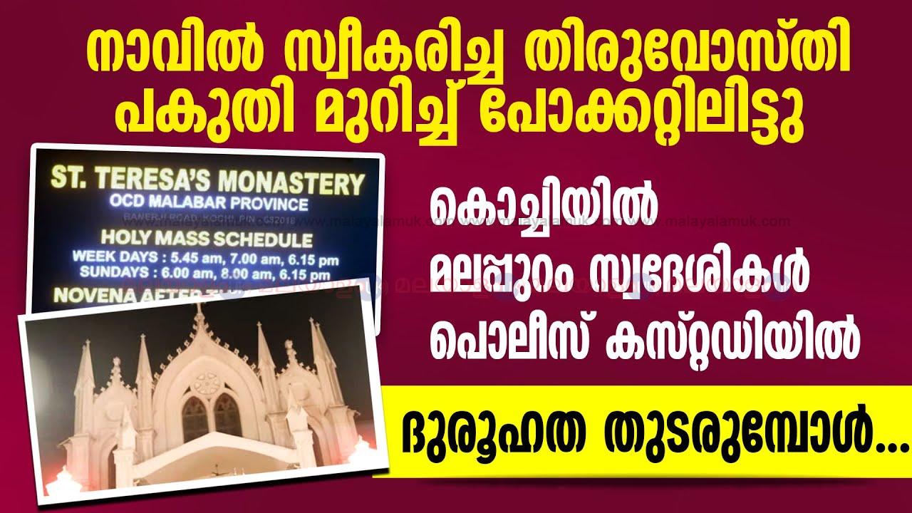 കഴിഞ്ഞ ദിവസം വൈകുന്നേരം വൈകിട്ട് 6.30 ന് നടന്ന കുർബാനയ്ക്കിടയിലാണ് നാടകീയ രംഗങ്ങൾ അരങ്ങേറിയത്. മലപ്പുറം താനൂർ സ്വദേശികളായ നാല് യുവാക്കളെയാണ് പൊലീസ് കസ്റ്റഡിയിൽ എടുത്തത്. കുർബാനയുടെ ഭാഗമായി പുരോഹിതൻ തിരുവോസ്തി നൽകിയപ്പോൾ അത് കയ്യിൽ സ്വീകരിച്ച ഇവർ പകുതി കഴിച്ചശേഷം ബാക്കി പോക്കറ്റിൽ ഇടുകയായിരുന്നു. ഇതോടെയാണ് അടുത്തുനിന്ന് വിശ്വാസികൾക്ക് സംശയം ഉയർന്നത്. തുടർന്ന് വിശ്വാസികൾ ഇടപെട്ട് ഇവരെ തടഞ്ഞു വയ്ക്കുകയും എറണാകുളം സെൻട്രൽ പൊലീസിനെ വിവരം അറിയിക്കുകയുമായിരുന്നു. വിശ്വാസികൾ അറിയിച്ചതനുസരിച്ച് സ്ഥലത്തെത്തിയ പൊലീസ് ഇവരെ സ്റ്റേഷനിലേക്ക് കൊണ്ടുപോയി.