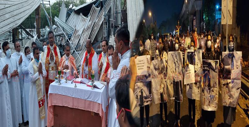 പൊളിച്ചു മാറ്റിയ ദേവാലയ അവശ്ഷ്ടങ്ങള്ക്കിടയില് നിന്ന് ഫരീദാബാദ് രൂപതയിലെ നിരവധി വൈദികര് ചേര്ന്ന് വൈകുന്നേരം 6.30ന് അര്പ്പിച്ച ദിവ്യബലിയില് പങ്കെടുക്കാന് നിരവധി വിശ്വാസികളെത്തി. ദിവ്യബലിക്ക് ശേഷമാണ് വൈദികരും വിശ്വാസികളും ചേര്ന്ന് മെഴുകുതിരി കത്തിച്ച് പ്രതിഷേധ പ്രകടനം നടത്തിയത്.