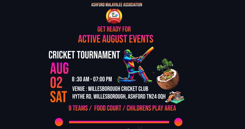 ആഷ്ഫോർഡ് :- ഇംഗ്ലണ്ടിന്റെ ആരാമമായ കെൻ്റിലെ ഏറ്റവും വലിയ അസോസിയേഷനായ ആഷ്ഫോർഡ് മലയാളി അസോസിയേഷന്റെ ആഭിമുഖ്യത്തിൽ അഖില യു കെ ക്രിക്കറ്റ് ടൂർണ്ണമെൻറ് വില്ലെസ് ബറോ കെന്റ് റീജിയണൽ ക്രിക്കറ്റ് ഗ്രൗണ്ടിൽ അരങ്ങേറും.