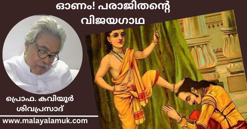 ഇവിടെ സത്യ ധർമ്മാദികൾക്ക് മൂല്യച്യുതി സംഭവിച്ചു. ധർമ്മം ചെയ്യേണ്ടയാൾ അധർമ്മിയായി. ധർമ്മി പരാജിതനായി പാതാള വാസിയായി. പക്ഷേ ആത്യന്തികമായി ധർമ്മിയായ പരാജിതനെ മനുഷ്യവംശം ആരാധിച്ചു. അധർമ്മികളായ വിജയികൾ വിസ്മരിക്കപ്പെട്ടു. ഈ കഥ തന്നെ നൂറ്റാണ്ടുകൾ ആവർത്തിക്കപ്പെടുന്നു. സോക്രട്ടീസിലൂടെ ക്രിസ്തുവിലൂടെ തുടങ്ങി നിരവധി ആചാര്യന്മാരിലൂടെ ഈ ഓണക്കഥ മറ്റു പല പേരുകളിലായി പുനർജ്ജനിക്കുന്നു… അനശ്വരത്വം എന്നും പരാജിതന്റെ വിജയമായി കാണാവുന്നതാണ്. ഓണാശംസകൾ!