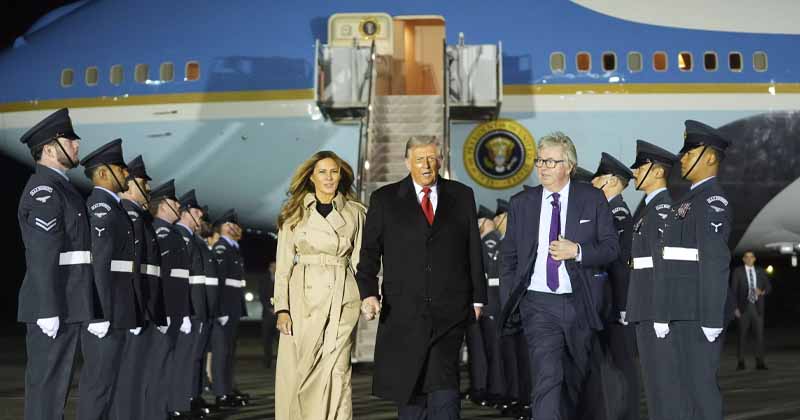 അമേരിക്കൻ പ്രസിഡന്റ് ഡൊണാൾഡ് ട്രംപും ഭാര്യ മെലാനിയയും രണ്ടാമത്തെ സ്റ്റേറ്റ് സന്ദർശനത്തിനായി യുകെയിൽ എത്തി. ലണ്ടൻ സ്റ്റാൻസ്റ്റെഡ് എയർപോർട്ടിൽ എയർഫോഴ്സ് വൺ വിമാനത്തിൽ നിന്ന് ഇറങ്ങിയ ട്രംപിനെ ചാൾസ് രാജാവിന്റെ പ്രതിനിധിയായ വിസ്കൗണ്ട് ഹെൻറി ഹുഡ്, വിദേശകാര്യ സെക്രട്ടറി ഇവറ്റ് കൂപ്പർ എന്നിവർ സ്വീകരിച്ചു. പിന്നീട് ട്രംപും ഭാര്യയും മാരീൻ വൺ ഹെലികോപ്റ്ററിൽ ലണ്ടനിലെ റെജന്റ്സ് പാർക്കിലെ യു.എസ്. അംബാസഡറുടെ ഔദ്യോഗിക വസതിയായ വിൻഫീൽഡ് ഹൗസിലേക്ക് പോയി.