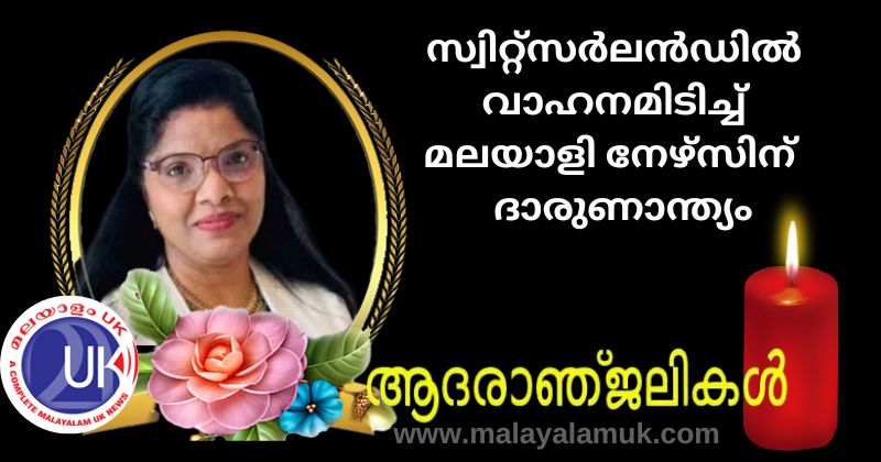 സ്വിറ്റ്സർലൻഡിൽ ജോലി ചെയ്തു വരികയായിരുന്ന മലയാളി നേഴ്സ് ബിന്ദു മാളിയേക്കൽ (46) റോഡ് ക്രോസിംഗിനിടെ വാഹനം ഇടിച്ചുണ്ടായ അപകടത്തിൽ മരണമടഞ്ഞു . തൃശൂർ വെളയനാട് സ്വദേശിനിയായ ബിന്ദു സെന്റ് ഉർബാനിൽ ആണ് താമസിച്ചിരുന്നത് . ഒക്ടോബർ ഒന്നിനായിരുന്നു അപകടം. ഡ്യൂട്ടിക്കായി ആശുപത്രിയിലേക്കു പോകുമ്പോൾ പെഡസ്ട്രിയൻ ക്രോസിംഗിൽ അമിത വേഗത്തിൽ വന്ന വാഹനം ബിന്ദുവിനെ ഇടിച്ചുതെറിപ്പിച്ചു. ഗുരുതരാവസ്ഥയിൽ ആശുപത്രിയിൽ പ്രവേശിപ്പിച്ചെങ്കിലും ഒക്ടോബർ അഞ്ചിന് വെന്റിലേറ്ററിൽ കഴിയുന്നതിനിടെ ബിന്ദുവിന്റെ ജീവൻ രക്ഷിക്കാനായില്ല.