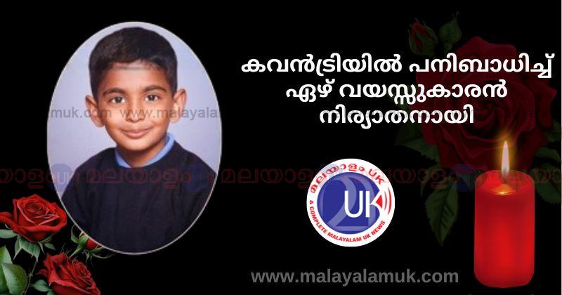 കവൻട്രിയിൽ ഏഴു വയസുകാരൻെറ അപ്രതീക്ഷിത വേർപാടിൻെറ ഞെട്ടലിലാണ് യുകെ മലയാളികൾ. എന്നും വരുന്നത് പോലെ സ്കൂളിൽ പോയി വന്നതായിരുന്നു ഏഴു വയസുകാരനായ റൂഫസ് കുര്യന്. വീട്ടിൽ വന്നതിന് പിന്നാലെ പനിയുടെ ലക്ഷണം കാണിച്ചതിനാൽ മരുന്ന് കഴിച്ച് കിടന്നുറങ്ങി. ശരീരത്തില് തടിപ്പുകള് കണ്ടപ്പോള് അല്പം ആശങ്ക തോന്നിയെങ്കിലും നേഴ്സായ അമ്മയ്ക്കും അതൊരു സാധാരണ പനിയായി മാത്രമാണ് തോന്നിയത്. എന്നാൽ അർധരാത്രിയോടെ കുട്ടിക്ക് കലശലായ ക്ഷീണവും ബുദ്ധിമുട്ടും തോന്നിയതിന് പിന്നാലെ അടുത്തുള്ള ആശുപത്രിയിൽ കുട്ടിയെ കൊണ്ടുവരികയായിരുന്നു.