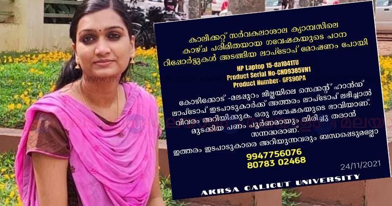 കാഴ്ചപരിമിതിയുള്ള ഗവേഷക വിദ്യാർഥിനിയുടെ മോഷണം പോയ ലാപ്ടോപ്പ് തിരികെ ലഭിക്കാനായി കൈകോർക്കുകയാണ് കാലിക്കറ്റ് സർവകലാശാലാ സമൂഹവും സഹൃദയരും. കോഴിക്കോട് ബീച്ചിൽ വെച്ച് മോഷണം പോയ ലാപ്ടോപ്പ് തിരികെ ലഭിക്കാൻ സമൂഹമാധ്യമങ്ങളിലൂടെ പ്രചാരണം നടത്തുകയാണ് സുഹൃത്തുക്കൾ. ഇതുവരെയുള്ള ഗവേഷണ വിവരങ്ങളെല്ലാം അടങ്ങിയ ലാപ്ടോപ്പ്, വിൽപ്പനക്കാർ ആരെങ്കിലും വാങ്ങിച്ചിട്ടുണ്ടെങ്കിൽ പണം നൽകി പോലും തിരികെ വാങ്ങാൻ തയാറാണെന്ന് സർവകലാശാലയിലെ ഗവേഷക സംഘടന പറയുന്നു.