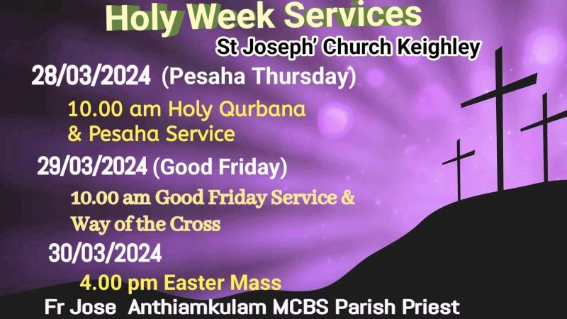 ആഷ് ഫോർഡ് : ക്രൊയിഡോൺ സെന്റ് പോൾ മലങ്കര മിഷന്റെയും ആഷ്ഫോർഡ് സെൻ്റ് തോമസ് മലങ്കര മിഷന്റെയും സംയുക്ത ആഭിമുഖ്യത്തിൽ ഈ വർഷത്തെ വിശുദ്ധ വാര ശുശ്രൂഷകളുടെ ഭാഗമായി 40 -ാം വെള്ളിയാഴ്ച ദിനത്തിൽ വിശുദ്ധ കുർബാനയും, കുരിശിന്റെ വഴിയും ഇടവക വികാരി ഫാ. കുര്യാക്കോസ് തിരുവാലിന്റെ മുഖ്യ കാർമികതത്തിൽ എയിൽസ്ഫോർഡ് പ്രിയറി ദേവാലയത്തിൽ 22 /3 /2024 വെള്ളിയാഴ്ച ഉച്ചയ്ക്ക് 1. 30 മുതൽ നടത്തപ്പെടുന്നു.