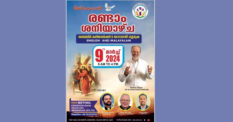 അഭിഷേകാഗ്നി രണ്ടാം ശനിയാഴ്ച്ച കൺവെൻഷൻ 9 ന് ബർമിങ്ഹാമിൽ നടക്കും. നോർത്താംപ്റ്റൻ രൂപത ബിഷപ്പ് എമിരിറ്റസ് പീറ്റർ ഡോയലിന്റെ അനുഗ്രഹ സാന്നിധ്യത്തിൽ പ്രമുഖ വചന പ്രഘോഷകൻ അഭിഷേകാഗ്നി കാത്തലിക് മിനിസ്ട്രി യുകെ യുടെ നേതൃത്വം ഫാ. ഷൈജു നടുവത്താനിയിൽ കൺവെൻഷൻ നയിക്കും.