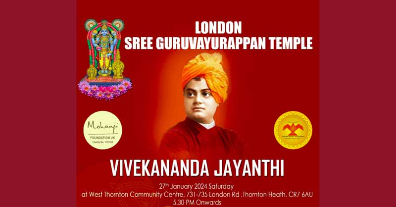 ലണ്ടനിൽ ഒരു ഗുരുവായൂരപ്പ ക്ഷേത്ര സാക്ഷാത്കാരം ലക്ഷ്യമാക്കി പ്രവൃത്തിക്കുന്ന ലണ്ടൻ ഹിന്ദു ഐക്യവേദിയുടെ നേതൃത്വത്തിൽ ഈ മാസത്തെ സത്സംഗം വിവേകാനന്ദ ജയന്തി ആഘോഷമായി ശനിയാഴ്ച്ച, ജനുവരി 27-ാം തീയതി ക്രോയിഡോണിലെ വെസ്റ്റ് തോൺടൺ കമ്മ്യൂണിറ്റി സെന്ററിൽ വച്ച് വൈകിട്ട് 5:30 മുതൽ ആഘോഷിക്കും.